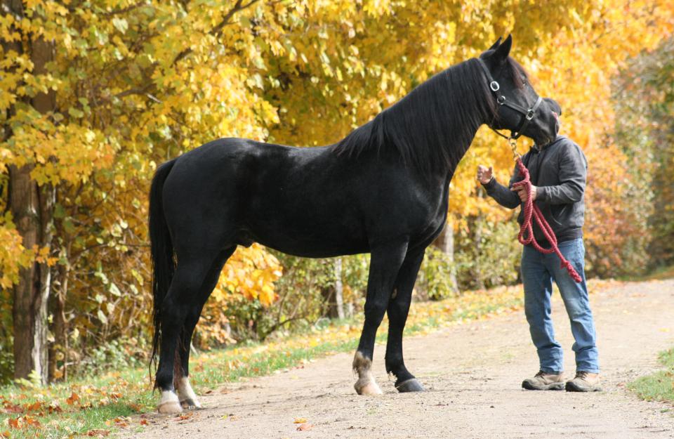 We would like to introduce you to our young black Curly stallion * TO Shadow's Black Diamond ("Ozzie"), a son of the handsome * Hawk's Midnite Shadow and 3/4 brother to the amazing * Shadow's Hawk Spirit (* Heartbreaker"). * Black Diamond is growing more handsome everyday as he matures and his movement is stunning as well. He is 15.1 hands tall and growing with powerful forward movement. We are very excited to see how he develops further. Black Diamond was green broke by Chet Martin and it appeared like they had a lot of fun in the process. After this Black Diamond started his dressage training with Rebecca Schoenhardt. She did a fine job of preparing him for some Walk-Trot and Training Level tests. Annie Baird has taken on Black Diamond's training and showing. They make a great team with both seeming to really enjoy their work. Annie has shown Black Diamond at the RCRA Snowflake Series Bronze Dressage Shows during the 2010 - 2011 winter months. They have earned decent scores and 7 first place ribbons competing at Training Level! Congratulations to both for their dedication and achievement in these Open classes! Annie Baird and *Black Diamond have had a successful summer in 2011 showing First Level at the open silver dressage shows. They earned 5 - 1st, 2 - 2nd, 2 - 3rd, and 1 - 6th placing in tests 1 to 3 at First Level. They were also Reserve Champion at the # 3 Caledon Dressage Silver Show and named Reserve Champion of Open First Level at the 2011 Western Ontario Silver Dressage Championships! Black Diamond and Annie earned two HOY awards in 2011 - one for Training Level and another at First Level. In 2012 Annie Baird and Black Diamond have been working hard at Second Level. They showed at all three Caledon Dressage Silver Shows bringing home ribbons from each. They earned the 2012 Caledon Dressage Year End Award as Reserve Champions in Open Second Level! They were also Grand Champions of the August Caledon Dressage Silver Show in Second level! Annie Baird and Black Diamond schooled Third Level dressage doing a great job with those flying changes. Update! Black Diamond had several years off from showing and "had the life!" just living with his mares and foals in pasture. He is being ridden now again - sometimes in the outdoor sand ring, other times out and about the farm. Black Diamond loves trail riding and is a very versatile stallion. He can be ridden by a novice rider as in the video below or he can give it all in the show ring!