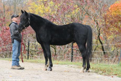 Condor is a black, curly coated stallion from our large black mare, Ebony Spirit who has given us off-spring maturing at 15.3 to 16 hands. Most of them have gone on to compete in dressage doing very well in open classes. Condor's sire, Black Diamond won many ribbons and championships showing up to Second Level and schooling Third Level dressage. Condor is a quality stallion with a very nice temperament. His movement is exceptional with a lot of impulsion and extension. Condor's first foal has been born in November 2023 - a handsome black curly colt with his sire's movement.