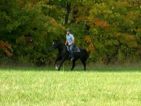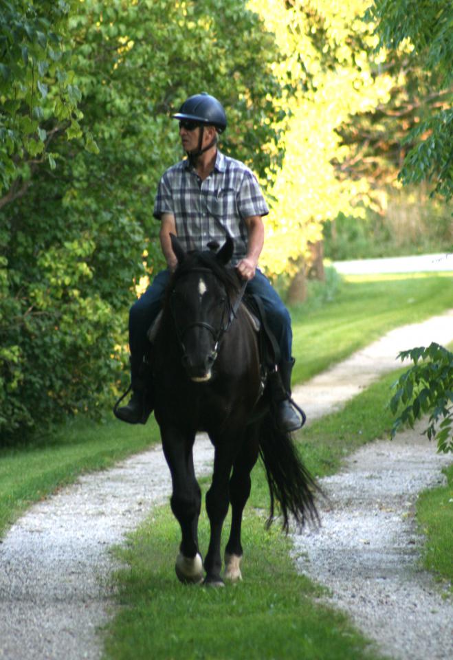 We would like to introduce you to our young black Curly stallion * TO Shadow's Black Diamond ("Ozzie"), a son of the handsome * Hawk's Midnite Shadow and 3/4 brother to the amazing * Shadow's Hawk Spirit (* Heartbreaker"). * Black Diamond is growing more handsome everyday as he matures and his movement is stunning as well. He is 15.1 hands tall and growing with powerful forward movement. We are very excited to see how he develops further. Black Diamond was green broke by Chet Martin and it appeared like they had a lot of fun in the process. After this Black Diamond started his dressage training with Rebecca Schoenhardt. She did a fine job of preparing him for some Walk-Trot and Training Level tests. Annie Baird has taken on Black Diamond's training and showing. They make a great team with both seeming to really enjoy their work. Annie has shown Black Diamond at the RCRA Snowflake Series Bronze Dressage Shows during the 2010 - 2011 winter months. They have earned decent scores and 7 first place ribbons competing at Training Level! Congratulations to both for their dedication and achievement in these Open classes! Annie Baird and *Black Diamond have had a successful summer in 2011 showing First Level at the open silver dressage shows. They earned 5 - 1st, 2 - 2nd, 2 - 3rd, and 1 - 6th placing in tests 1 to 3 at First Level. They were also Reserve Champion at the # 3 Caledon Dressage Silver Show and named Reserve Champion of Open First Level at the 2011 Western Ontario Silver Dressage Championships! Black Diamond and Annie earned two HOY awards in 2011 - one for Training Level and another at First Level. In 2012 Annie Baird and Black Diamond have been working hard at Second Level. They showed at all three Caledon Dressage Silver Shows bringing home ribbons from each. They earned the 2012 Caledon Dressage Year End Award as Reserve Champions in Open Second Level! They were also Grand Champions of the August Caledon Dressage Silver Show in Second level! Annie Baird and Black Diamond schooled Third Level dressage doing a great job with those flying changes. Update! Black Diamond had several years off from showing and "had the life!" just living with his mares and foals in pasture. He is being ridden now again - sometimes in the outdoor sand ring, other times out and about the farm. Black Diamond loves trail riding and is a very versatile stallion. He can be ridden by a novice rider as in the video below or he can give it all in the show ring!