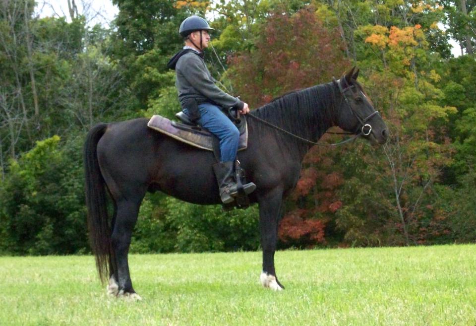 Tall 15.2 hand, black, straight haired, Curly sporthorse stallion with awesome movement for dressage. Registered with ABCR and Curly Sporthorse International. Carbonado has powerful, forward movement with lots of extension, suspension, and impulsion. A lovely topline and pretty head with a perfect diamond, hense his name Carbonado (meaning black diamond in Spanish). Carbonado's sire, Black Diamond won many awards and ribbons showing up to Second Level dressage and schooling Third Level. Carbonado has a 3/4 sibling showing Prix St. George. UPDATE: Carbonado is now a gelding and is very quiet, reliable, and solid under saddle. He would make a lovely dressage horse with his big floating movement and he loves trail riding as well. He is the type of horse you could take to a show one day and trail ride another. Carbonado comes when called, has perfect ground manners, and trailers well. He has been tested as hypoallergenic. Carbonado loves people and is looking for his special person.